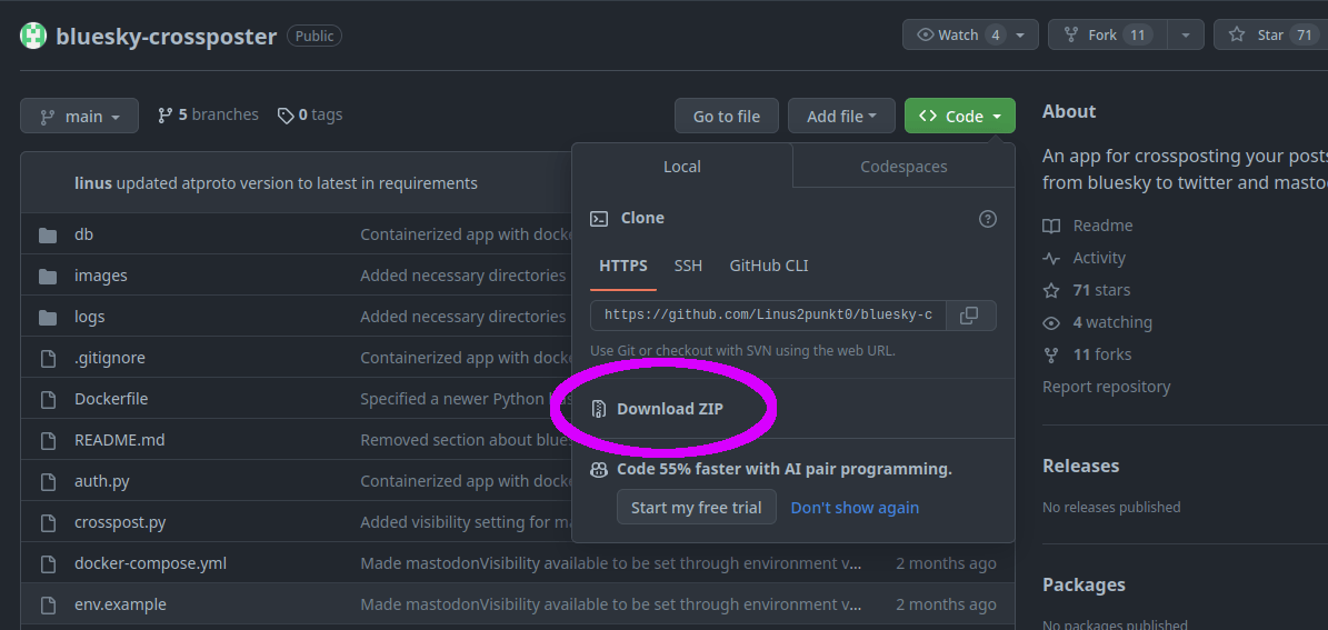 Le plus simple consiste à récupérer le code sous forme de fichier zip en cliquant sur "Code" puis "Download ZIP":