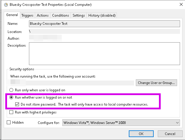 Depuis l'onglet "General", sélectionner l'option "lancer ce truc même si l'utilisateur n'est pas connecté" et la case à cocher juste en dessous qui indique de ne pas stoquer le mot de passe dans la tâche planifiée.