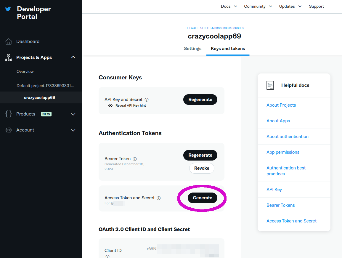Depuis la page de l'app qui vient d'être créée il y a un bouton "Generate" en regard de "Access Token and Secret".