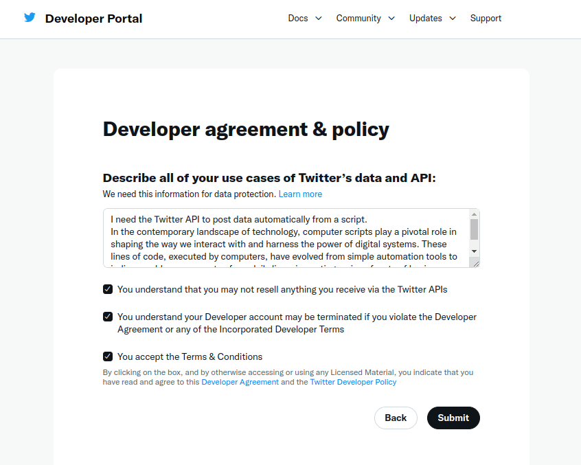 Vient ensuite un écran un peu louche où ils demandent d'écrire un exposé de 250 caractères minimum pour décrire nos "cas d'utilisation" de l'API de Twitter. Oui c'est très bizarre.