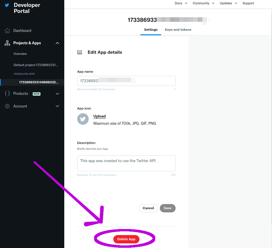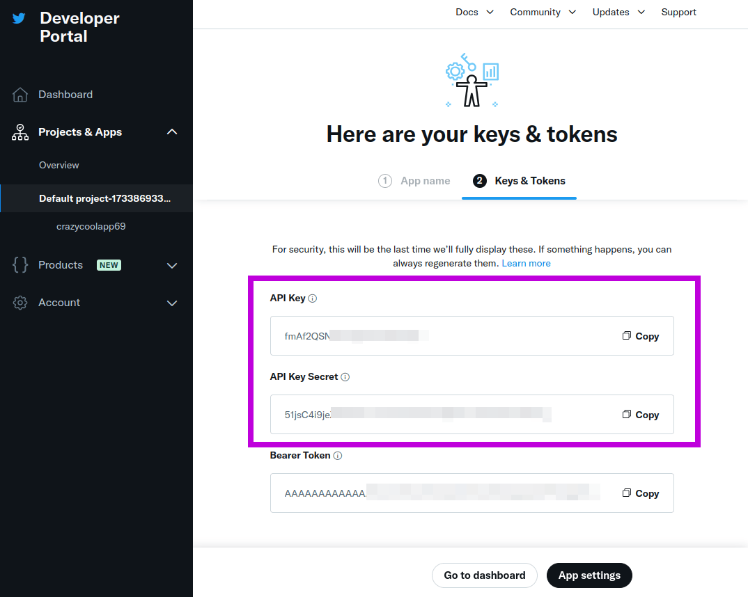 - Les valeurs API Key et API Key Secret révélées lors de la création de l'app;