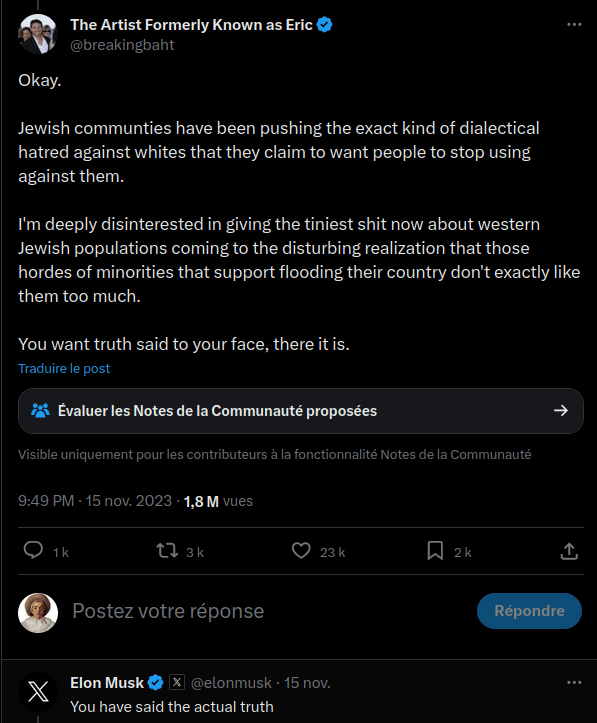 Et, en réalité, je ne trouve pas que ce tweet soit "antisémite" comme ça a été présenté partout dans la presse, et je pense pas que Musk lui-même soit antisémite. Il est juste tellement profond dans le monde magique du club des victimes-d'ado-activistes-sur-internet qu'il se rend pas compte que le tweet qu'il acquiesce n'a qu'un bout du petit orteil dans la réalité et le reste est du caca étalé sur des corps encore chaud.