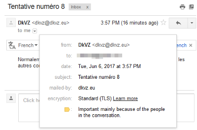 Par conséquent si vous envoyez un email depuis un Postfix à une adresse Gmail, vous voyez un cadenas rouge ouvert à côté de "Me" quand vous visualisez les détails d'un email, avec la mention que votre serveur n'a pas encrypté le message. Je n'ai absolument aucune idée de si ça rentre en compte dans la classification comme spam, mais vu que c'est rouge et que le rouge ça fait peur (et surtout que je commence à être désespéré), je me dis, pourquoi pas essayer d'arranger ça?