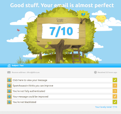 Idem avec www.mail-tester.com. Cet outil réceptionne un mail que vous lui envoyez, il suffit alors d'attendre un peu puis cliquer le bouton et vous avez votre rapport. Je ne sais plus tout ce que j'avais chipoté quand j'ai eu le mien: