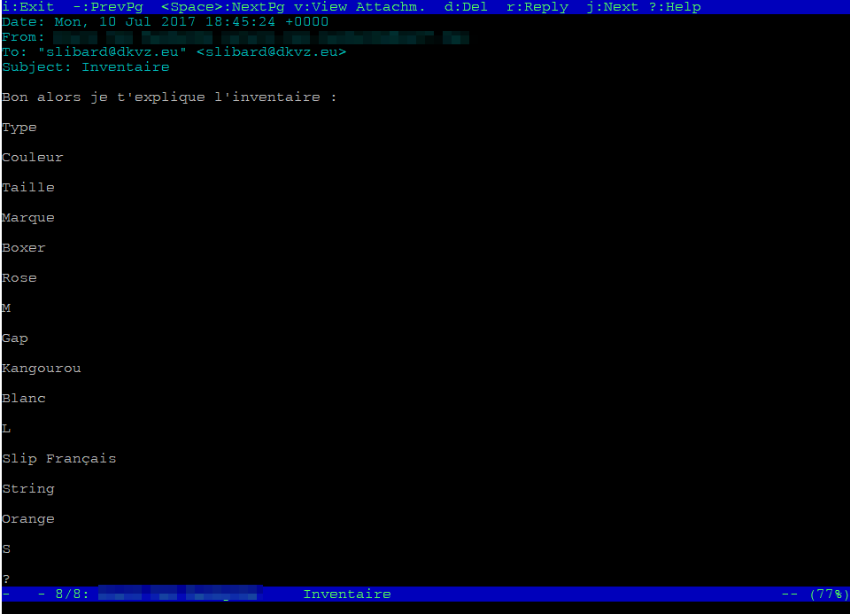 Par exemple si vous utilisez mutt sur une box qui a également une interface graphique (ce qui est une très drôle d'idée mais je ne juge pas (si en fait je juge à mort)) vous pouvez spécifier que les types MIME d'image peuvent être ouverts avec un visualisateur d'image local, ou encore les fichiers HTML par Chrome ou Firefox. Nous comme on a pas d'interface graphique on va devoir utiliser un navigateur en ligne de commande.