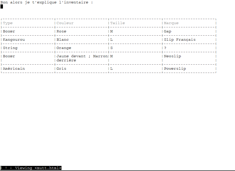 Au niveau des alternatives de contenu présentes dans les emails que l'on vous envoie (parce que ce que vous envoyez est toujours juste en texte brut dégeulasse) mutt essayera toujours de charger le texte pur si cette alternative existe. Si votre correspondant utilise le Outlook fourni avec Windows 98 peut-être que vous n'aurez que l'email en HTML. Il est possible de fournir à mutt des moyens d'afficher des fichiers non-texte en lançant un programme externe.