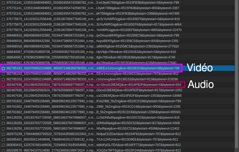 Si la vidéo était aussi un ".mp4", l'audio devrait suivre juste après dans la recherche parce qu'elle est récupérée juste après l'audio (en tous cas sur mes cas d'étude) au niveau temporel.