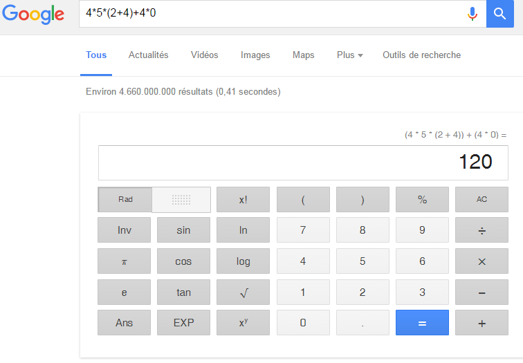 Google il a même ajouté des parenthèses à l'expression pour vous aider à comprendre la priorité des opérateurs. Trop beau... Je pleure. C'est tellement simple. Tu peux même t'amuser à résoudre d'autres calculs de ce genre sur ton Smartphone, depuis les chiottes. Je pense que même avec juste le WAP c'est faisable.