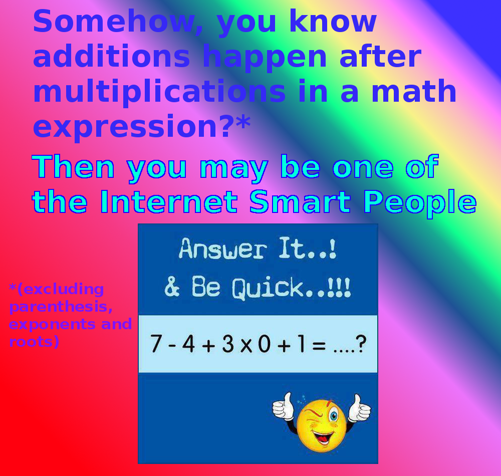 Est-ce que le mec lache son image dans la nature puis jubile tout seul de voir le monde entier répondre? L'astuce est absolument toujours la même, il faut qu'il y ait un x 0 dans l'expression comme ça des tas de gens vont répondre 0 parce qu'ils ont appris à l'école que tout ce qui est multiplié par 0 ça fait 0. C'est effectivement le cas, merci l'éducation nationale, excellent travail. Le problème c'est que le résultat des expressions sur ces images n'est quasiment jamais zéro, et c'est ça qu'ils trouvent... Marrant, ou je sais pas trop quoi.