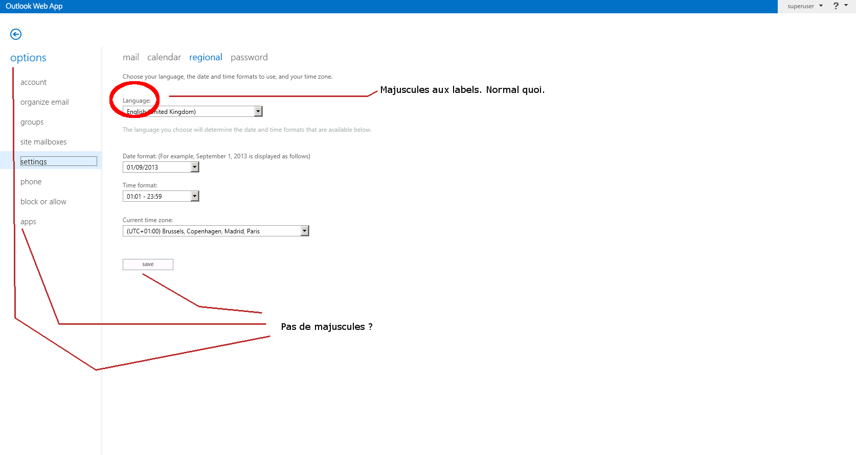 Quand je vois ce bouton "save" en minuscule, je peux pas m'empêcher de penser qu'un stagiaire a oublié de mettre une majuscule. Pourtant, ça me paraît fort improbable qu'il ait également oublié les majuscules partout dans les titres des pages et dans le menu de gauche (et le menu du dessus aussi d'ailleurs). Regardez n'importe quelle interface informatique, humaine ou pas, n'importe quel journal, magazine, tablette romaine ou qu'est-ce, les titres ont leur première lettre en majuscule, c'est une des règles de la vie et la mort et du destin, comme quand un bulldog pète ça peut pas sentir le cerfeuil. C'est juste pas possible, stop.