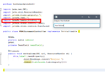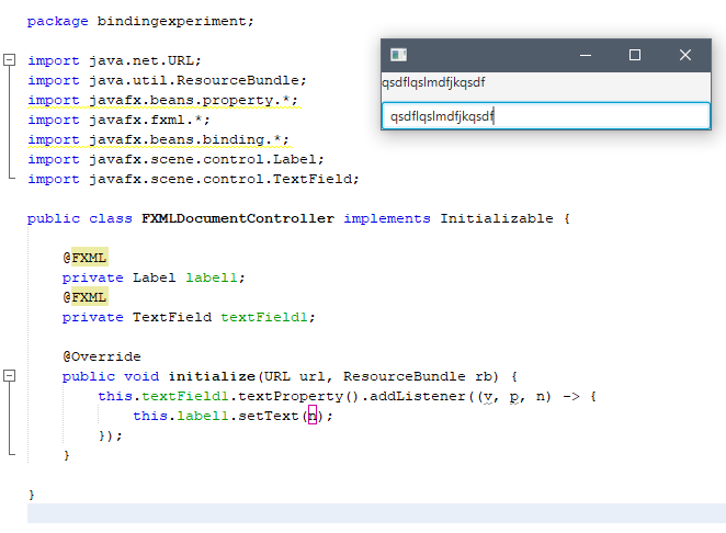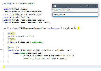 Pour mettre à jour notre interface par rapport à ce que fait le service, toujours avec mon Label et mon Textfield, j'ai écrit ceci dans la méthode initialize() de mon contrôleur: