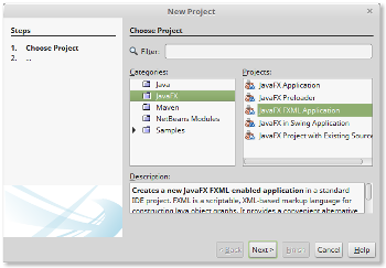 Lancez Netbeans. Créez un nouveau projet, et choisissez JavaFX -> JavaFX FXML Application. Vous pouvez spécifier le nom et package de la classe qui va étendre Application (et donc créer le premier Stage) ainsi que le nom du fichier FXML qui sera auto-généré avec le squelette Hello World similaire à celui présenté dans ma section "A la sauvage" plus haut.