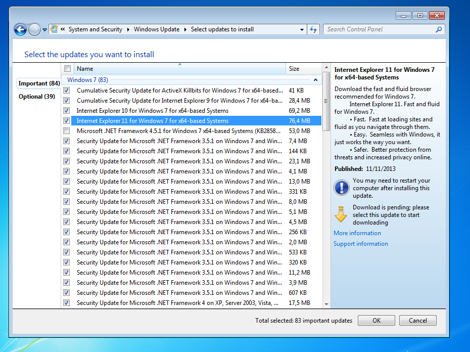 Me reste plus qu'à installer IE 10. Je suppose qu'il est dans les Windows Update. Il y est mais euh... IE 11 aussi ? Est-ce qu'il faut absolument le 10 ? OK prout j'installer les deux (??).