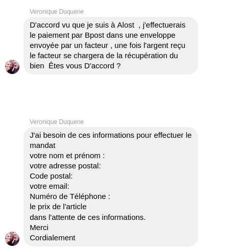 Déjà ils n'utilisent pas la technique de cliquer sur le bouton "est-ce que ce truc est toujours en vente?" (très à point pour le type qui vendait vraiment un "truc") - Ils créent un groupe avec vous dedans ou bien ils vous demandent de les contacter par message vous-même, puis ils vous demandent le prix de votre truc (???), votre nom, adresse, téléphone, numéro de compte, ...