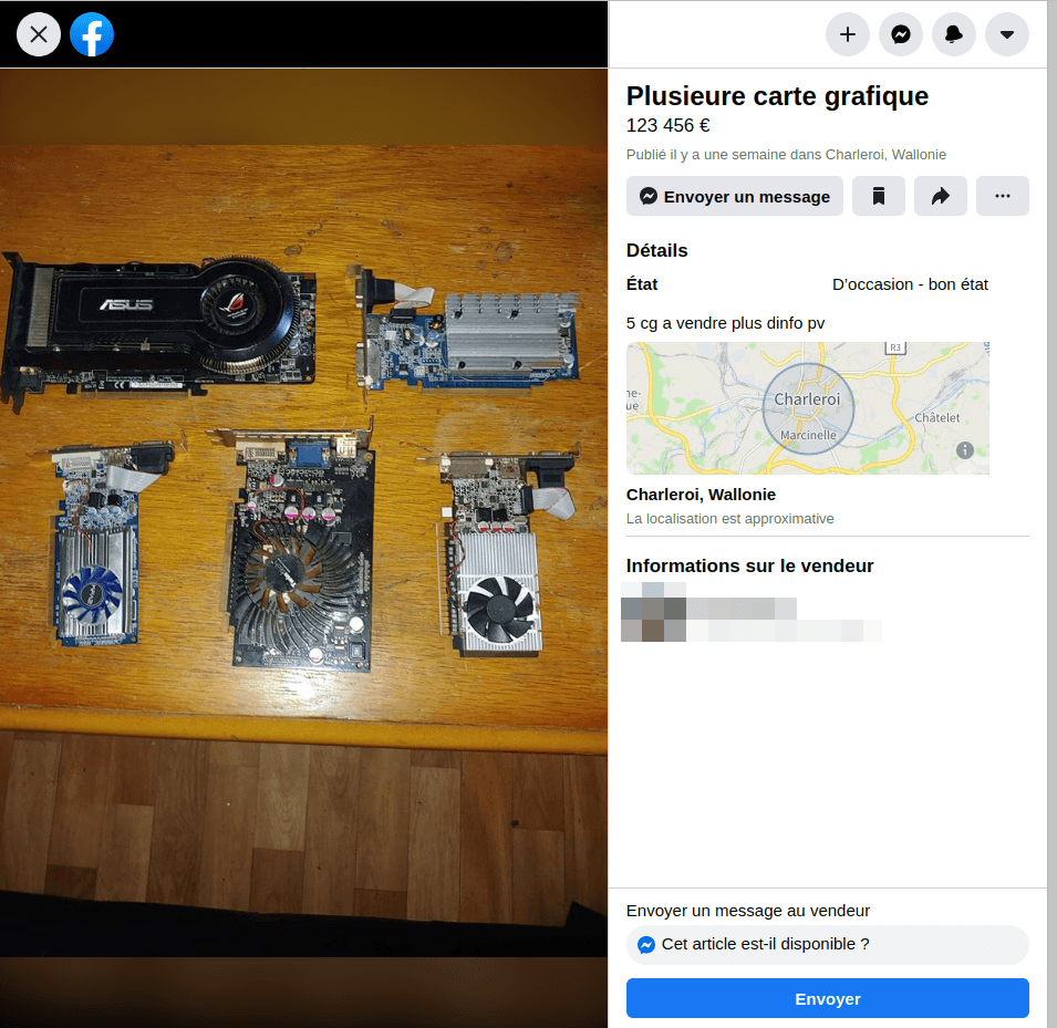 L'autre truc assez courant c'est les gens qui vendent un assortiment de cartes graphiques. Et je parle même pas d'un ex-mineur qui aurait une série de cartes de la même série qui trainent, je parle d'un genre de mini-musée de la carte graphique avec voyage dans le temps et tout.