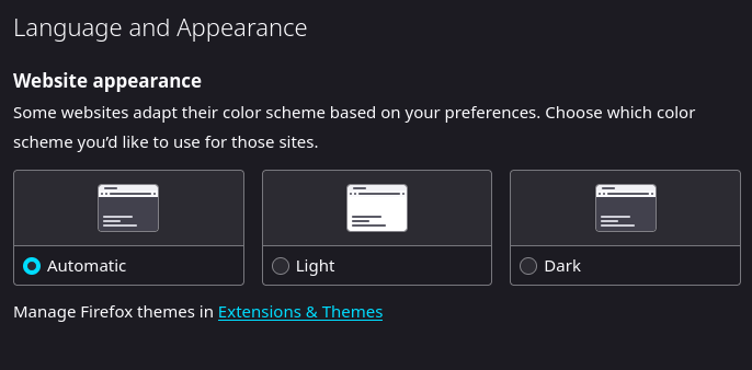 De fait, Les navigateurs permettent générallement de choisir si vous voulez suivre le mode sélectionné au niveau système d'exploitation, ou un mode en particulier comme ici pour Firefox:
