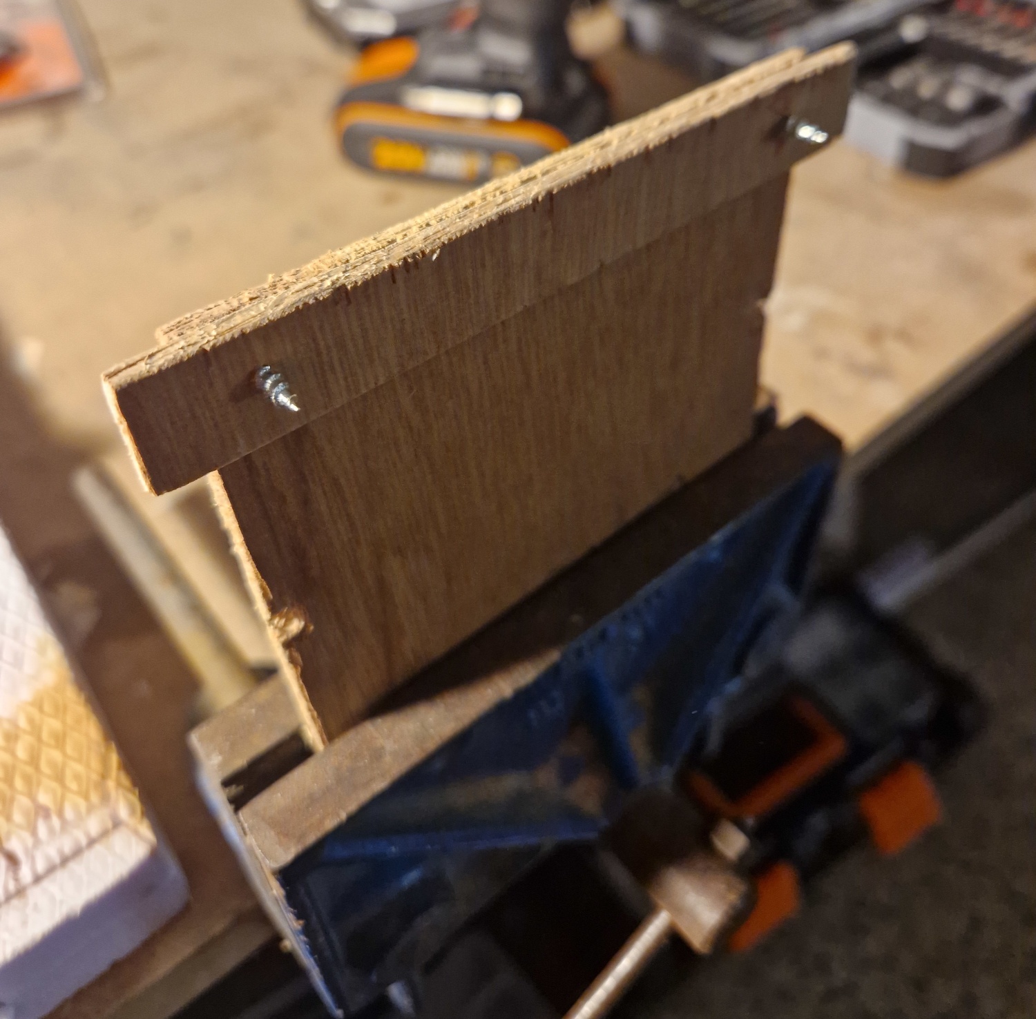 On assemble ensuite les deux pièces, avec des vis trop grandes. Parce que j'en ai pas d'autres sous la main.