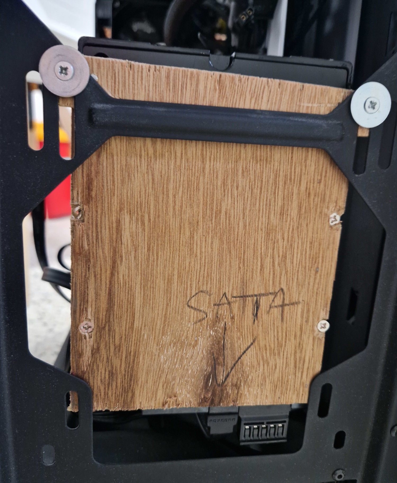 Je pense créer une vieille plaque à fixer sous le dispositif de stockage de masse pour ensuite lui fixer un autre bout de bois plus long qui servira à la fixation dans la tour.