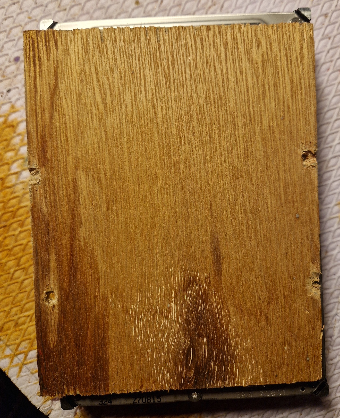 On le pose ensuite sur une plaque en bois prédécoupée à la main à peu près aux dimensions d'un disque dur en regrettant de ne pas avoir découpé une plaque un peu plus spatieuse parce que, là, les trous sont difficiles à aligner et très, très au bord.
