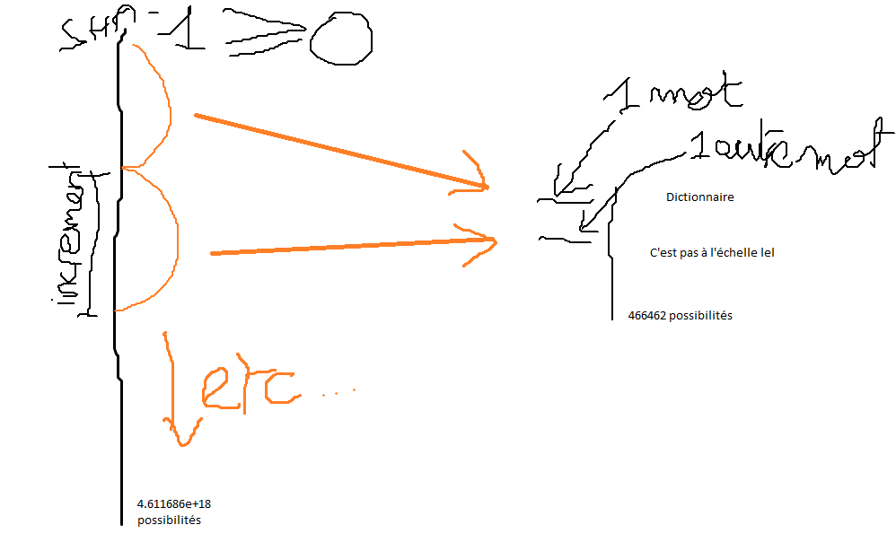 OKAY donc combien de fois je peux faire rentrer tout mon dictionnaire dans ces 64 bits? Je me suis dit que c'était cool de faire ce calcul parce que comme ça je peux faire correspondre toute une série de valeurs de hash sha-1 à un seul mot du dictionnaire.