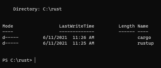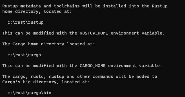 Reste plus qu'à exécuter rustup-init.exe dans la même session Powershell, il devrait indiquer les répertoires précédemment assignés aux variables d'environnement CARGO_HOME et RUSTUP_HOME: