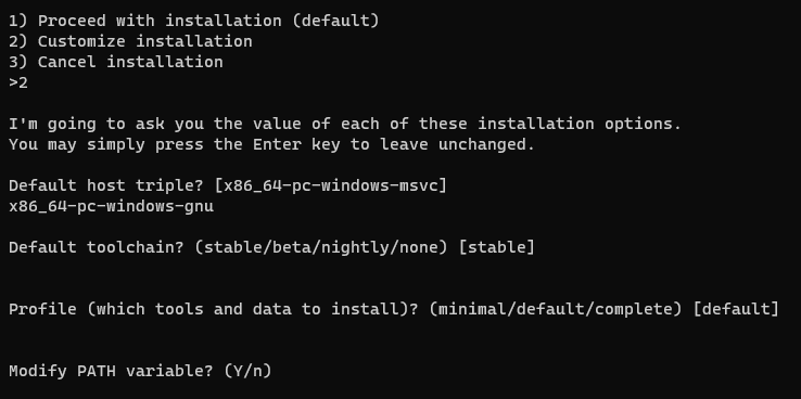 Il s'agit à nouveau de choisir l'installation personnalisée et coller ceci comme "Default host triple" (super explicite comme étiquette soit-dit en passant):