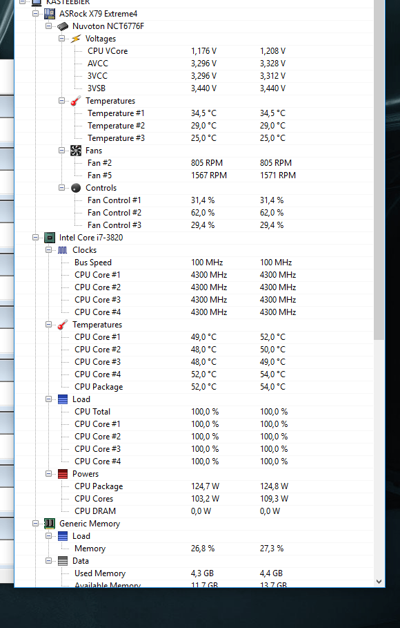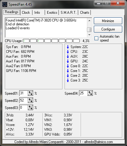 Les températures sont loin du max de 65° (qui est assez faible pour une température max, mais la puce 3820 a une grande surface) et ce sous Prime95, qui, j'explique au cas où, présente une situation de stress thermique qui n'existe pas en utilisation normale pour un CPU.