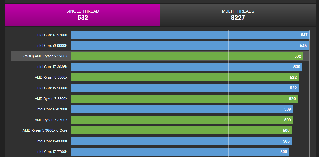Au niveau performance multi-coeur, le 9900k est 65% moins bien que le 3900x d'AMD (et je suis généreux). Ce pourcentage fait un peu mal au postérieur et est principalement dû aux 12 coeurs du 3900x (contre 8 pour l'Intel) et le boost d'AMD qui peut être soutenu raisonnablement sur tous les coeurs.
