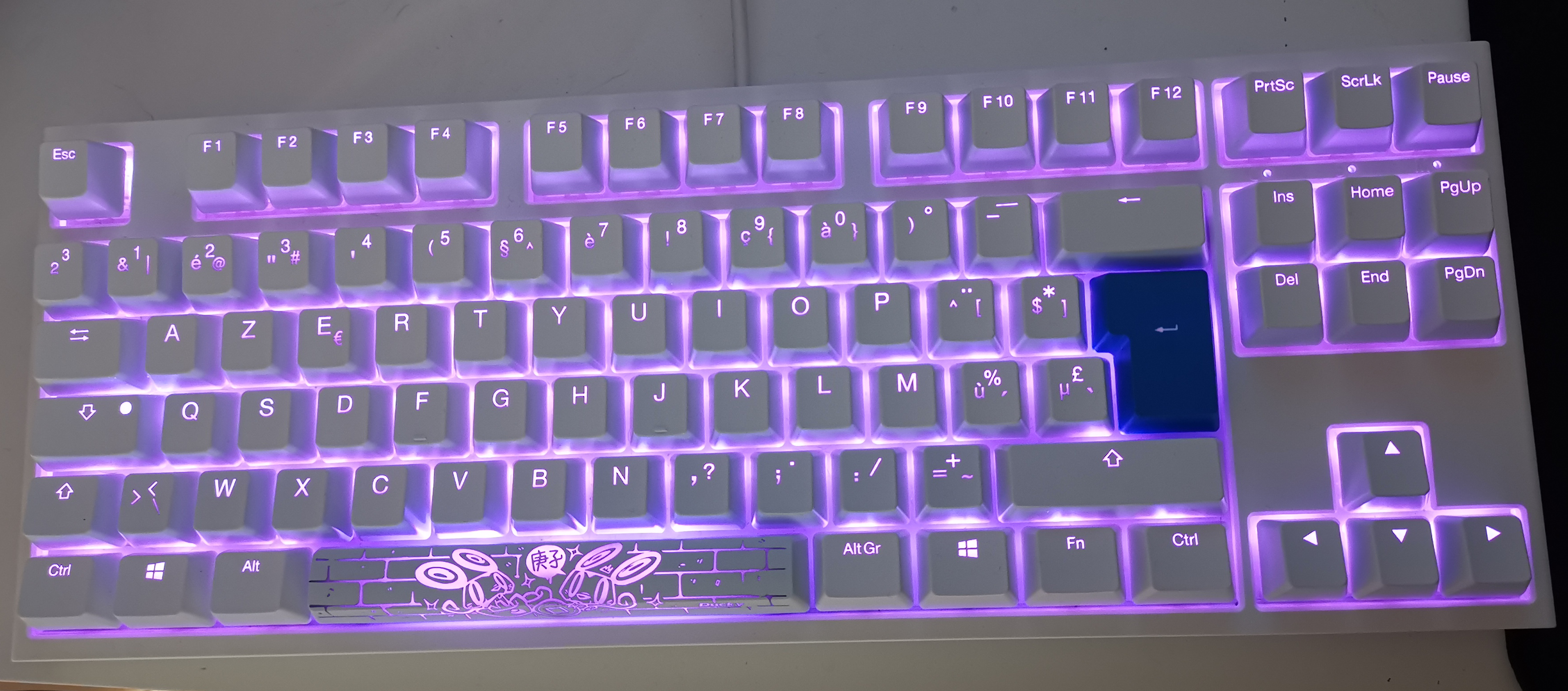 Je l'ai remplacé par un Ducky Shine, avec DES LEDS ROSES. Excellent clavier aussi quoi que construit d'une manière tellement rigide qu'il est assez bruyant et fait des bruits de ressorts. Rien de très dérangeant pour jouer mais légèrement fatiguant pour coder et taper toute la journée (ce pourquoi j'utilise un Topre RealForce de toutes manières).