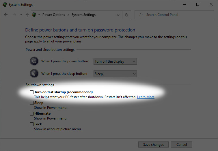 Des gens suggèrent de désactiver ce bon vieux "Fast startup" pour corriger le problème. Effectivement... Mon startup est légèrement moins fast mais il n'y a plus le problème.