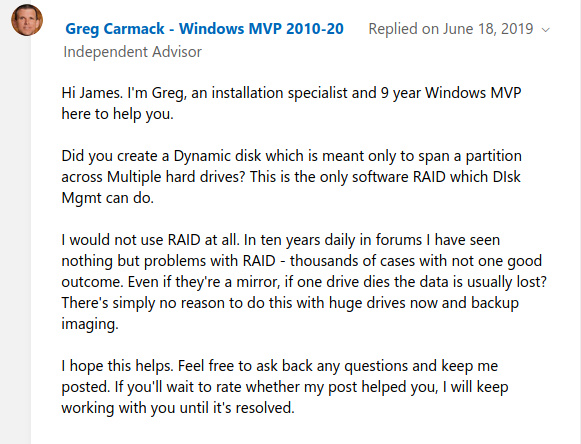 En bref là ça a l'air génial mais je sais pas trop ce qu'il se passe si un disque dur ne répond plus, j'ai lu un témoignage inquiétant sur un forum d'un Microsoft MVP: