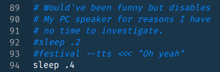 Je m'étais aussi dit que ce serait marrant d'avoir un "Oh yeah" au synthétiseur de voix avant un des couplets comme dans la chanson sauf que ça désactive le haut parleur PC pour une raison qui doit exister quelque part. Genre l'ordi se rend compte qu'il est vraiment en train de beeper du Despacito SUPER FORT et souffre enfin des remors qu'il doit à l'univers.