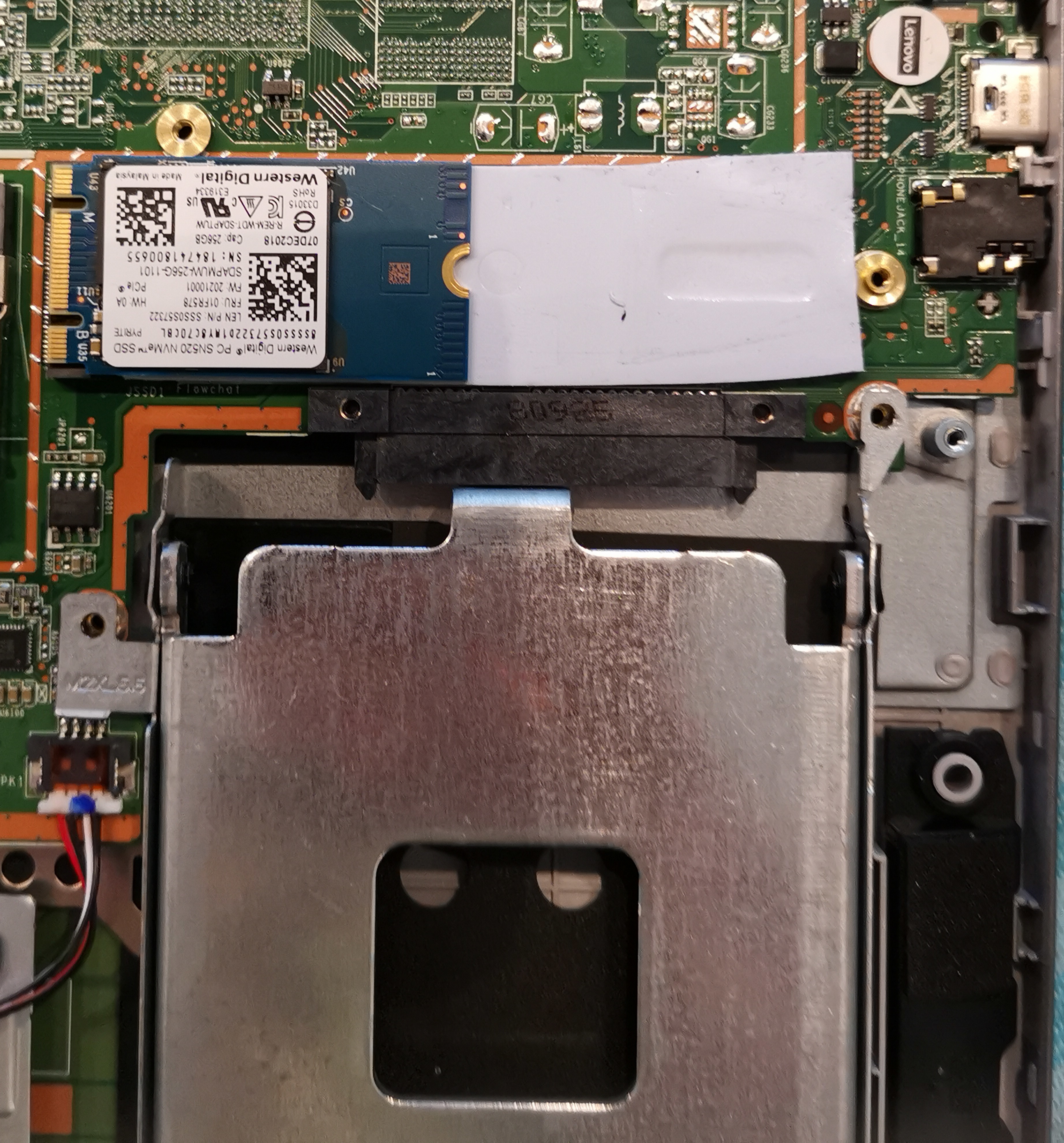 Pour revenir à mon opération (DIEU MERCI), le SSD est assez facilement accessible, je constate que c'est un M.2 SATA (et non pas NVME, les SSD M.2 les plus cheapos — mais ça m'étonne pas vraiment) et qu'il y a un port SATA 2.5 pouces disponible, sous une grosse plaque d'acier lourde et totalement inutile que je comprends pas pourquoi c'est là.