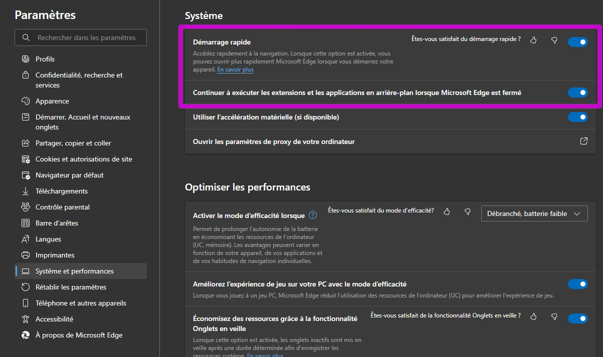 Tous ces bidules sont dans le menu "Système et performances" des paramètres de Edge.