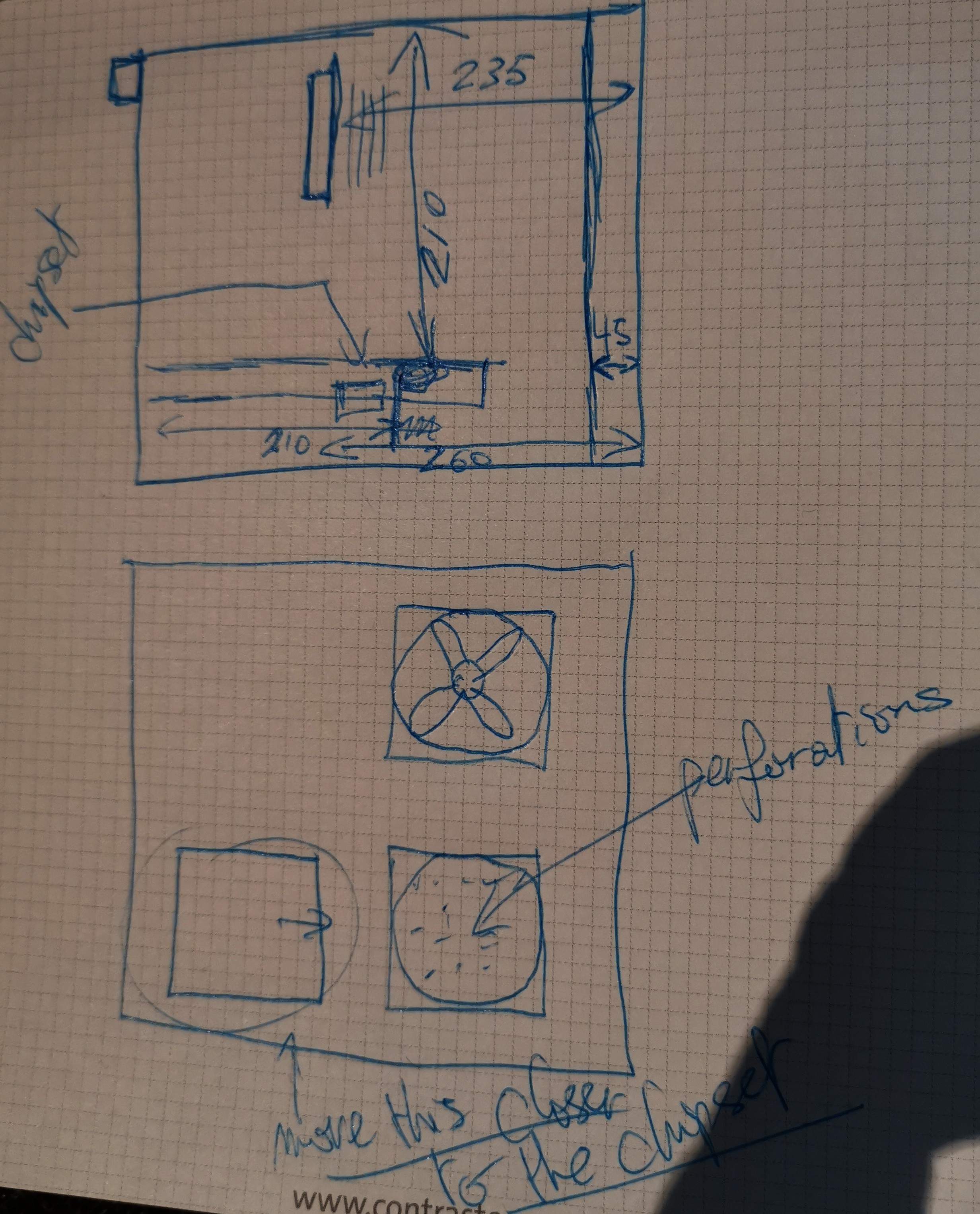 Ouais je sais pas ce qu'il s'est passé j'ai dû être distrait à un moment ou l'autre. Ou bien c'est juste que l'autre face était encore plus moche. Je sais plus. Puis de toutes façons c'est pas grave parce qu'un des ventilos donne bien directement sur la carte graphique (bien que un peu trop près de l'arrière où les ventilos de la carte tirent de l'air) et celui du dessus fournit clairement de l'air frais au processeur.