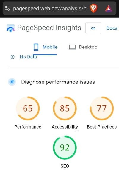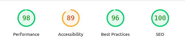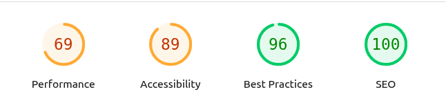 Non pas que l'ancien site avait un meilleur score, mais le test de conformité web.dev (c'est à peu près la même chose que Lighthouse dans les navigateurs Chrome) m'a permis de réperer pas mal de petits soucis (il s'agit du score pour mobile):